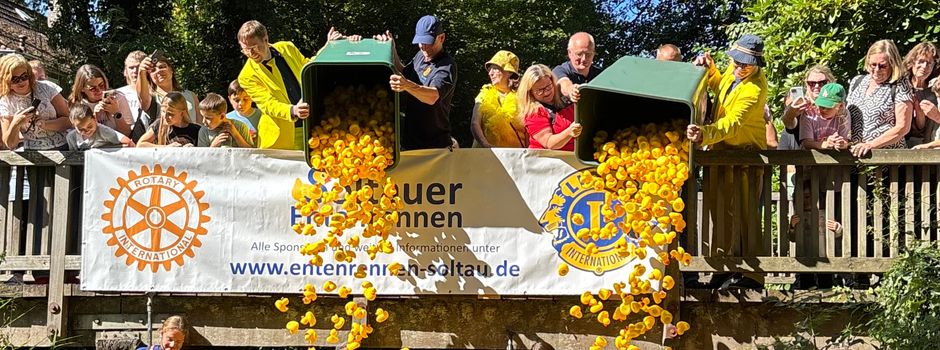 Bereits zum siebten Mal konnten die Renn-Enten des Lions-Clubs Soltau-Böhmetal und des Rotary-Clubs Soltau bei bestem Wetter an den Start gehen. Diese Mal starteten die 2.000 quietschgelben Gummienten, um ein Sportangebot für alle Soltauer Kindergärten zu finanzieren. Und tatsächlich konnten alle 2.000 Lose für das Rennen im Vorfeld verkauft werden. „Dabei war es einige Male wie das sprichwörtliche 7. Jahr“ wie sich Mitinitiator Dr. Tobias Wollny erinnert. „Wir haben recht spät einen sicher geglaubten Hauptsponsor verloren. Ohne Unterstützer können wir aber nicht die vollen 10.000 Euro aus dem Losverkauf für den guten Zweck einsetzen. Glücklicherweise ist das Autohaus Winkelmann kurzfristig eingesprungen. Zusammen mit der langjährigen Unterstützung der IHG konnte das Rennen starten.“